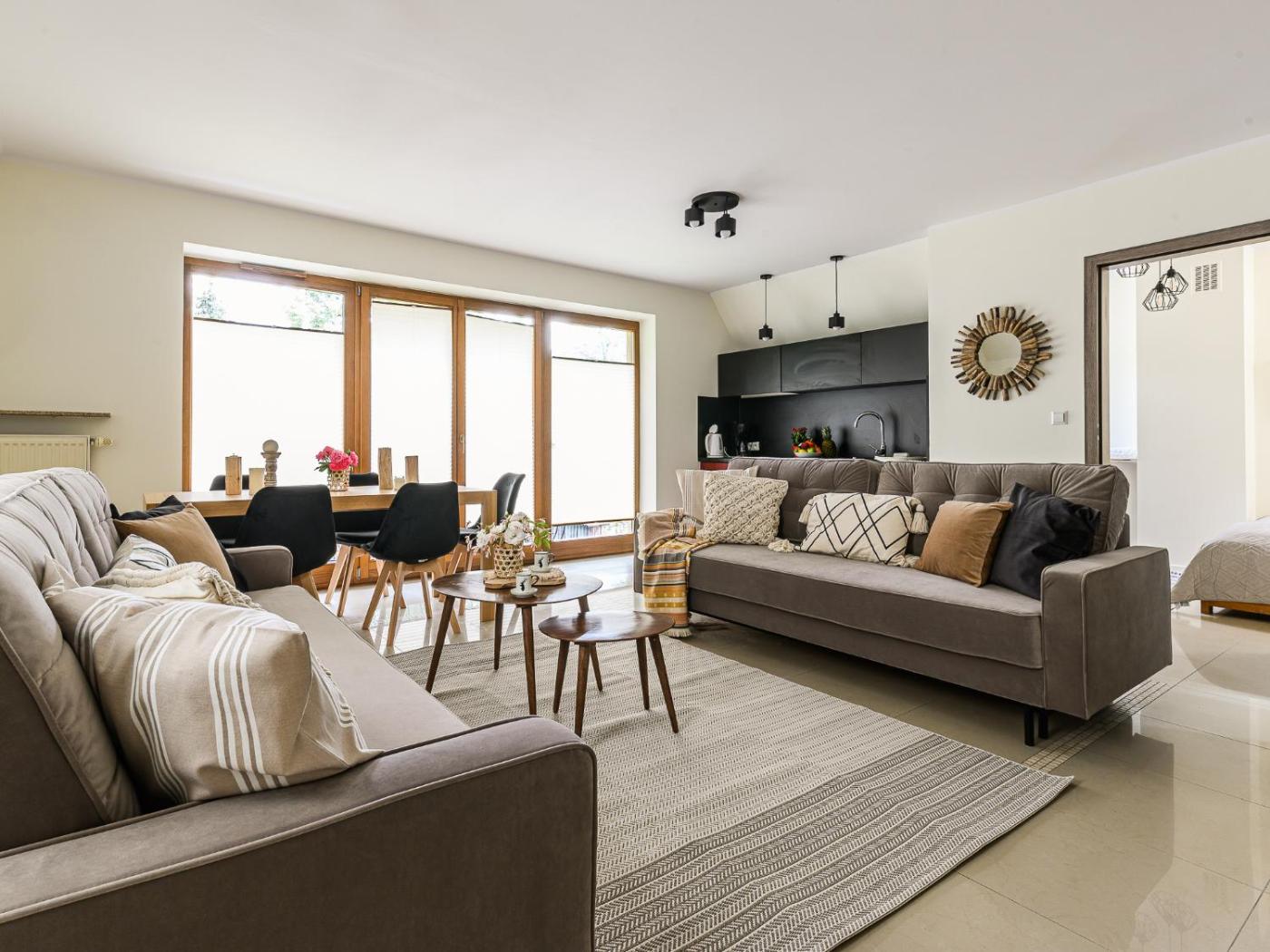 Oferta apartamentu obejmuje kilka sypialni (2), salon, aneks kuchenny z pełnym wyposażeniem, w tym lodówką i ekspresem do kawy, a także łazienkę (1) z prysznicem oraz suszarką do włosów. W apartamencie zapewniono ręczniki i pościel.